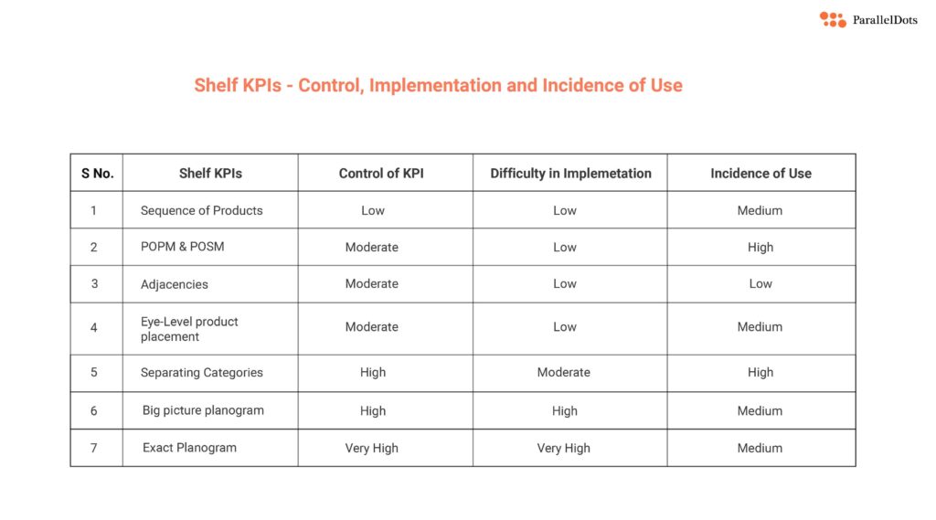 The exact planogram KPI is useful in stores where either the brand has very high control on visual display KPIs or very low, depending upon its dominance and its relationship with the retailer account.